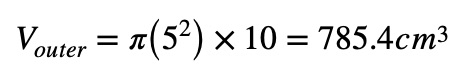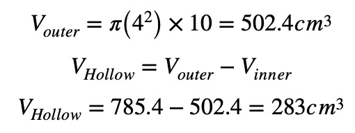 If a hollow pipe has an outer radius of 5 cm, an inner radius of 4 cm, and a height of 10 cm: