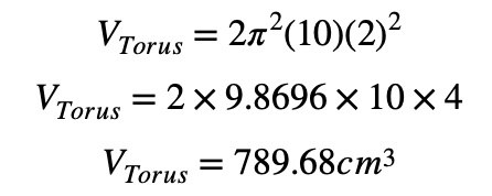 So, the volume of the torus is approximately 789.68 cubic centimeters.