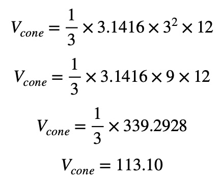 Thus, the volume of the ice cream cone is 113.10 cubic centimeters. This volume represents how much ice cream the cone can hold.