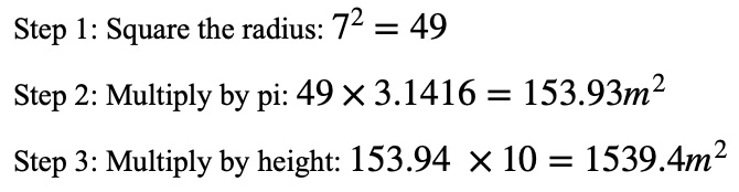 Imagine you’re designing a cylindrical water tank with a radius of 7 meters and a height of 10 meters. To find the volume of water the tank can hold: